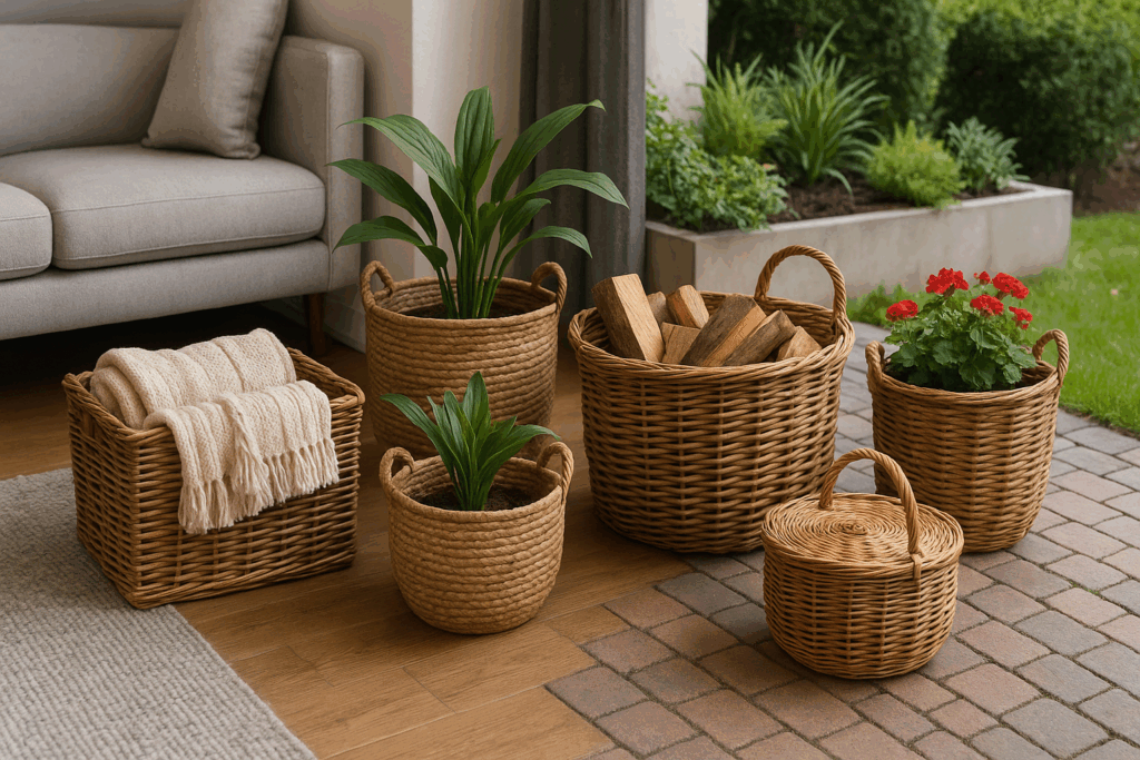 I haven eller på terrassen kan større kurve bruges til at samle brænde til bålfadet, til opbevaring af tæpper til kølige sommeraftener eller til at præsentere høsten fra køkkenhaven – eksempelvis æbler, tomater eller krydderurter. De flettede materialer falder naturligt ind i udemiljøet og patineres smukt over tid.