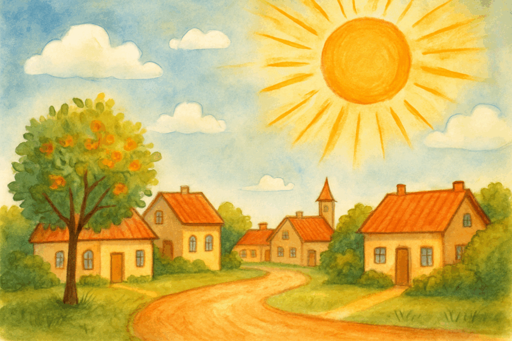 Der var engang en lille, fredelig by, hvor solen skinnede så kraftigt, at husenes tage glimtede som guld.