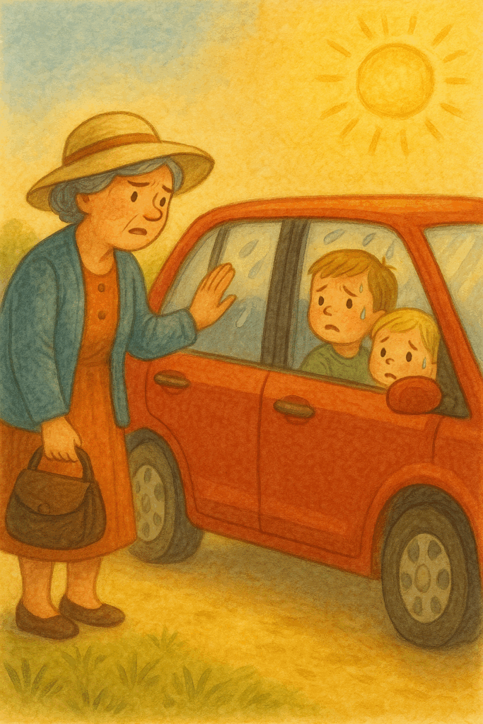 Pludselig fik hun øje på en mørk bil, der stod stille midt i solen. Inde i bilen sad to små børn med røde kinder.
