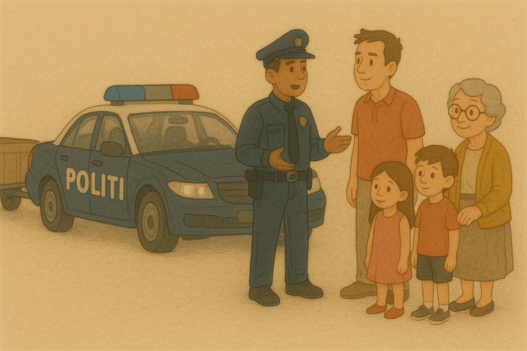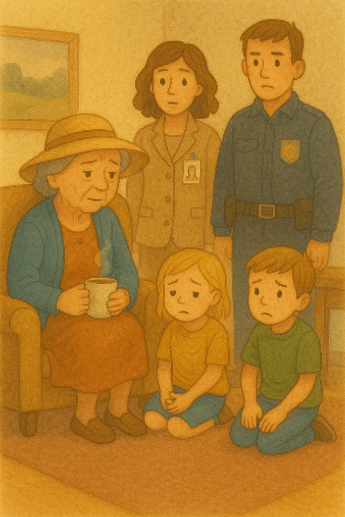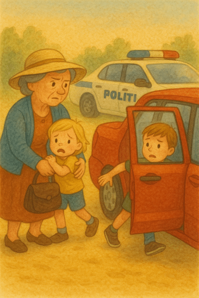 “Det er alt for varmt,” sagde Fru Alva og gik hurtigt hen til bilen. Døren var ulåst, og hun fik børnene ud. En politibil kom forbi.