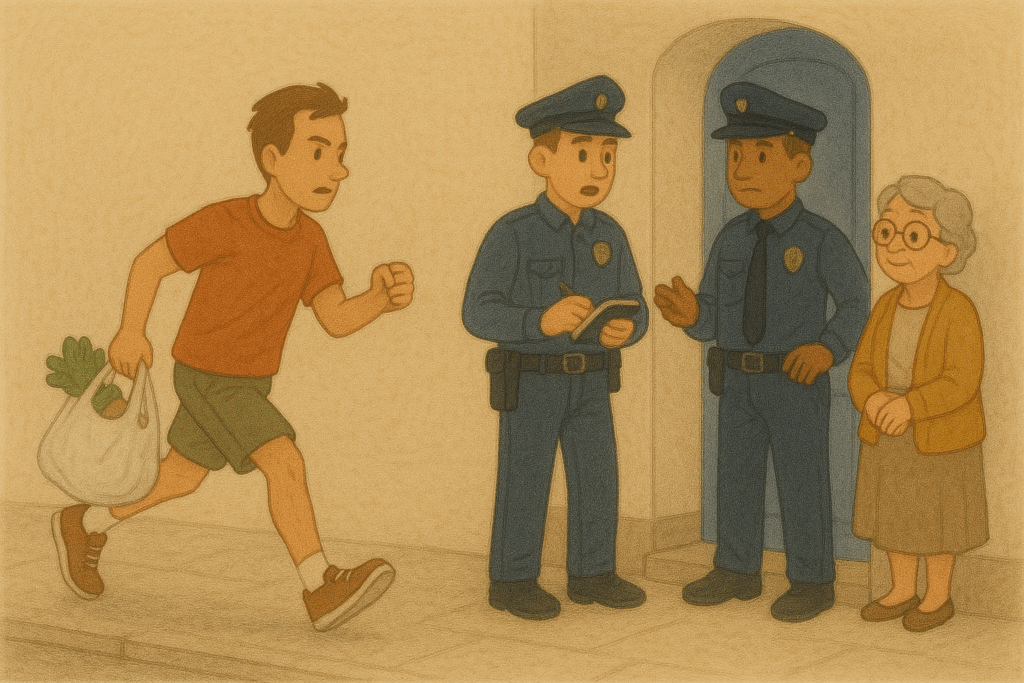 Efter 20 minutter kom faren løbende fra supermarkedet med poser i hænderne. Han blev meget overrasket.