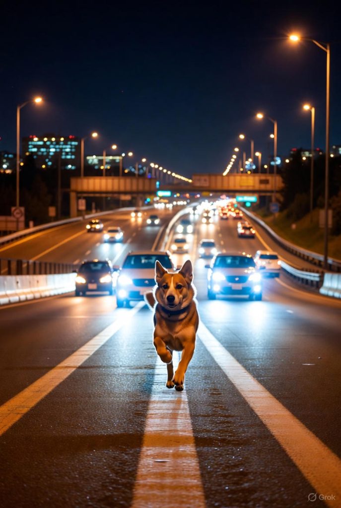 Kl 23.05 fik politiet anmeldelse om, at en løs hund strejfede rundt langs motorvejen. En patrulje fik fanget hund ind på en nærliggende mark, mens trafikken blev orienteret via trafikradioen. En 75-årig mand, som blev lagt fast til at være hundens ejer, blev sigtet efter hundeloven.